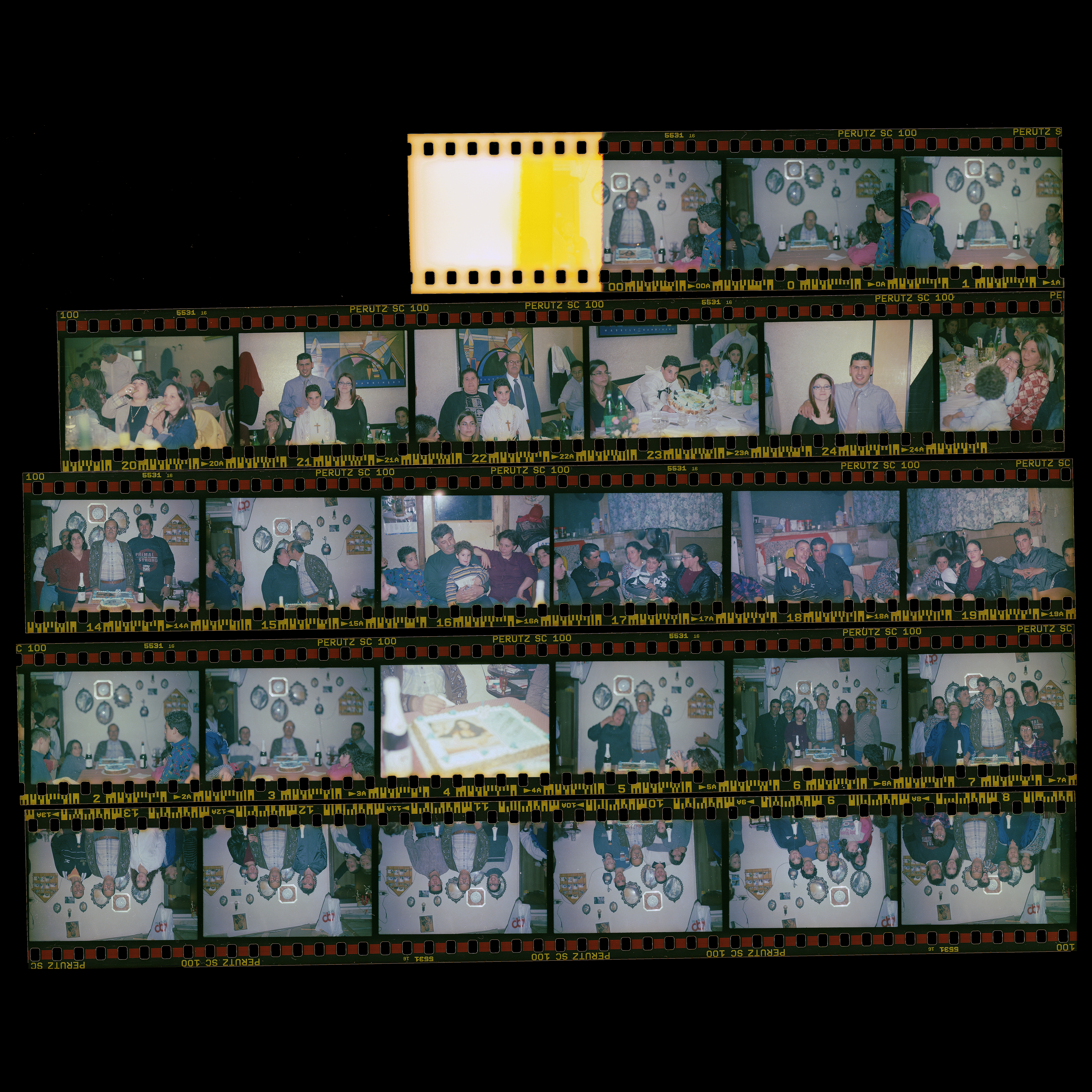 This factor of profound personality, of empathy towards a family of strangers, pushed me to "dig" into the negatives that came to me by chance, investigating the details which allow one to place this scene in space and time. Through the digital blowup I analyzed the details that lie in the background of the story: on the cake the inscription "Happy 68th Birthday Biagio" appears, on the sweatshirt of a nephew appears the name of a football club from Scicli, behind a child appears the calendar of 2000.